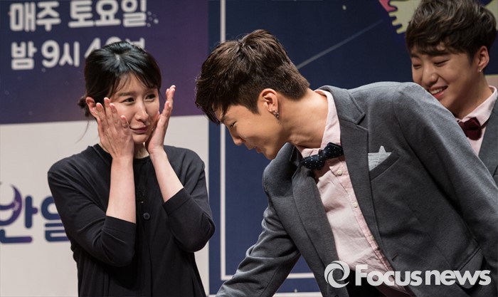 (서울=포커스뉴스) 21일 오후 서울 마포구 JTBC 사옥에서 열린 예능프로그램 '반달친구' 제작발표회에 참석한 아이돌 그룹 위너의 멤버 이승훈(오른쪽)과 김수아PD가 인사를 하고 있다.