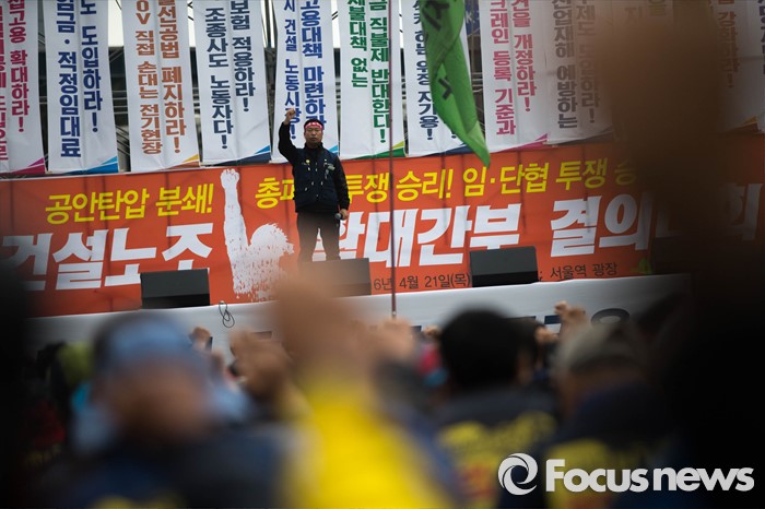 (서울=포커스뉴스) 21일 오후 서울역 앞에서 민주노총 전국건설노동조합 전국의 간부들이 건설노조 확대간부 결의대회를 열고 건설민생법안 통과를 촉구하는 집회를 하고 있다.