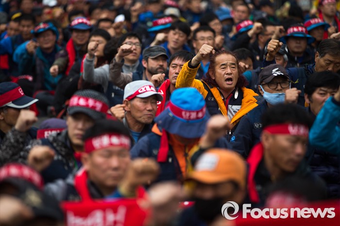(서울=포커스뉴스) 21일 오후 서울역 앞에서 민주노총 전국건설노동조합 전국의 간부들이 건설노조 확대간부 결의대회를 열고 건설민생법안 통과를 촉구하는 집회를 하고 있다.