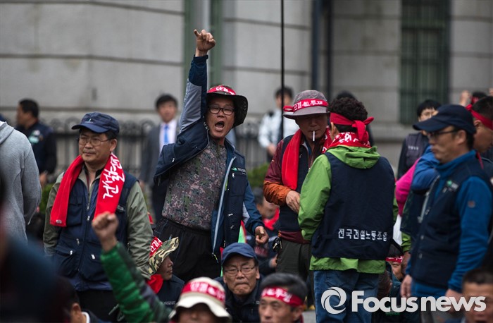 (서울=포커스뉴스) 21일 오후 서울역 앞에서 민주노총 전국건설노동조합 전국의 간부들이 건설노조 확대간부 결의대회를 열고 건설민생법안 통과를 촉구하는 집회를 하고 있다.