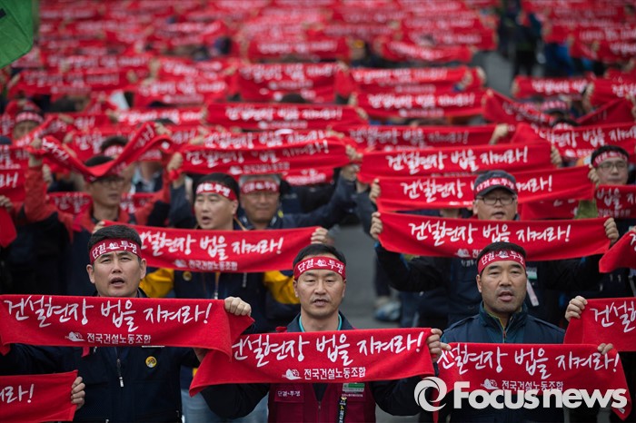 (서울=포커스뉴스) 21일 오후 서울역 앞에서 민주노총 전국건설노동조합 전국의 간부들이 건설노조 확대간부 결의대회를 열고 건설민생법안 통과를 촉구하는 집회를 하고 있다.
