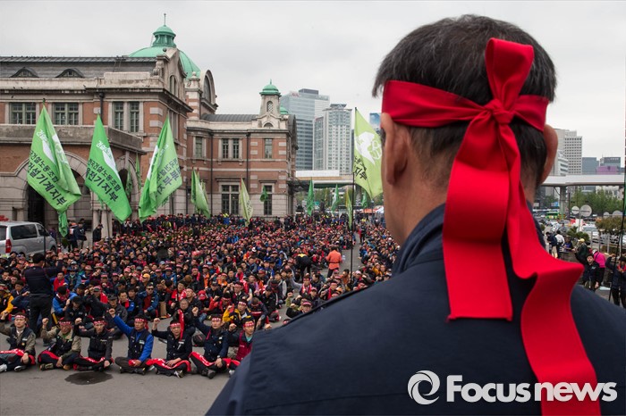 (서울=포커스뉴스) 21일 오후 서울역 앞에서 민주노총 전국건설노동조합 전국의 간부들이 건설노조 확대간부 결의대회를 열고 건설민생법안 통과를 촉구하는 집회를 하고 있다.