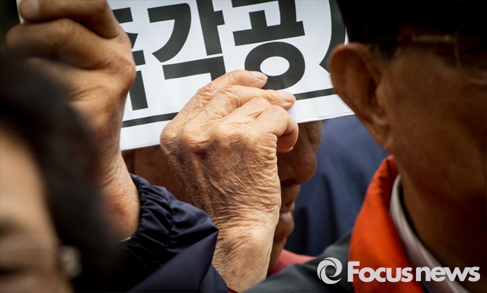 (서울=포커스뉴스) 최근 전경련의 차명계좌 자금 지원 의혹을 받고 있는 어버이연합 회원들이 21일 오후 서울 용산구 시사저널 사옥 앞에서 시사저널 규탄 기자회견을 하고 있다.