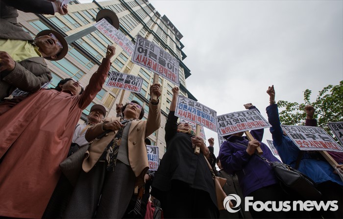 (서울=포커스뉴스) 최근 전경련의 차명계좌 자금 지원 의혹을 받고 있는 어버이연합 회원들이 21일 오후 서울 용산구 시사저널 사옥 앞에서 시사저널 규탄 기자회견을 하고 있다.