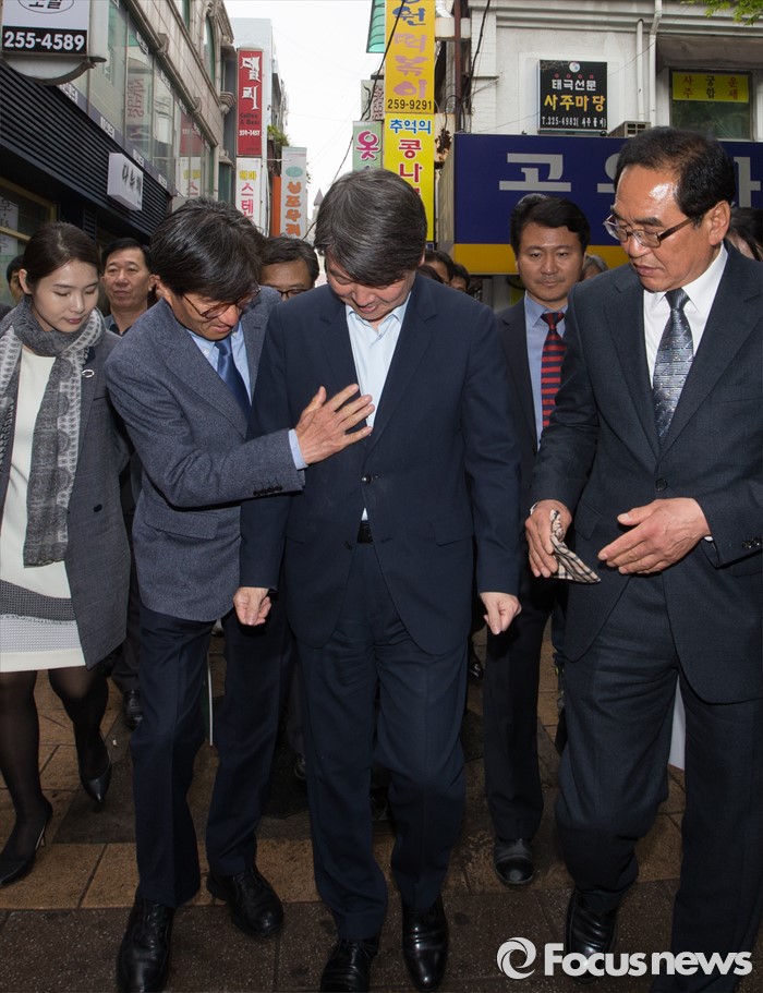 (청주=포커스뉴스) 안철수 국민의당 상임공동대표가 21일 오후 충북 청주 상당구 성안길을 찾아 시민들과 인사를 하던중, 천막에서 떨어진 빗을 맞자 당원들이 닦아주고 있다. 안 대표는 4.13 국회의원선거에서 국민의당을 지지해준 것에 대한 감사의 뜻을 전했다.