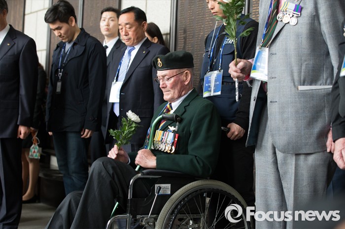 (서울=포커스뉴스) 임진강 및 가평전투 65주년을 맞은 21일 오후 서울 용산구 전쟁기념관에서 6.25전쟁에 참전했던 영연방(영국, 캐나다, 호주, 뉴질랜드) 참전용사들이 묵념을 하고 있다.
