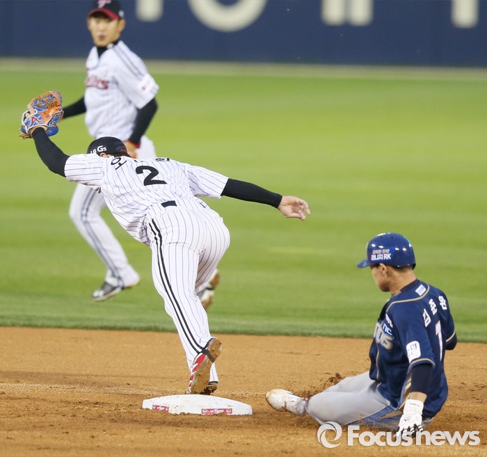 (서울=포커스뉴스) 21일 서울 잠실구장에서 열린 2016 프로야구 NC-LG 경기 3회초 1사 1루에서 LG 2루수 정주현이 NC 나성범의 타구를 잡아 바로 2루로 토스해주며 1루주자 김준완을 포스아웃시키고 있다.