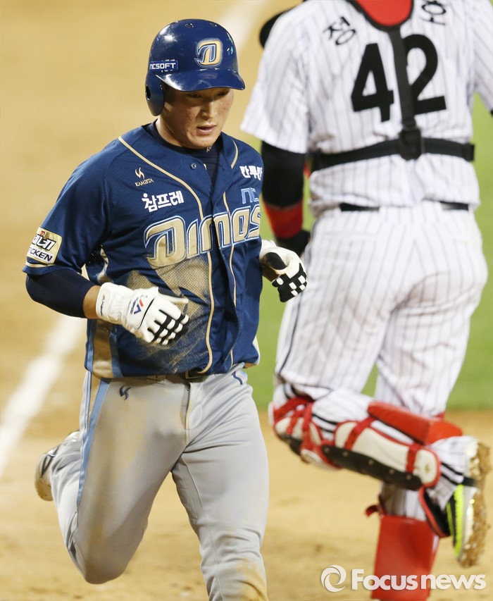 (서울=포커스뉴스) 21일 서울 잠실구장에서 열린 2016 프로야구 NC-LG 경기 5회초 무사 2루에서 NC 나성범의 우익수 오른쪽에 떨어지는 2루타때 2루주자 김준완이 홈인하고 있다.
