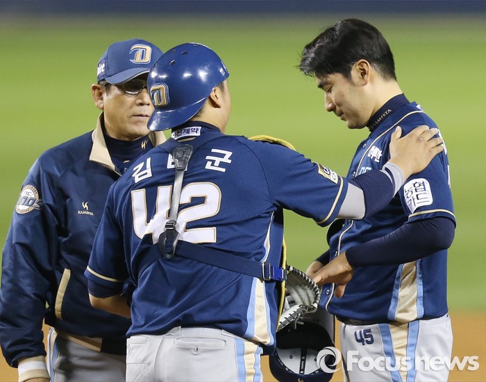 (서울=포커스뉴스) 21일 서울 잠실구장에서 열린 2016 프로야구 NC-LG 경기에서 9회말 NC 마무리 투수 임창민이 주자를 내보내자 최일언 투수 코치와 포수 김태군이 마운드에 올라가 안정시키고 있다.