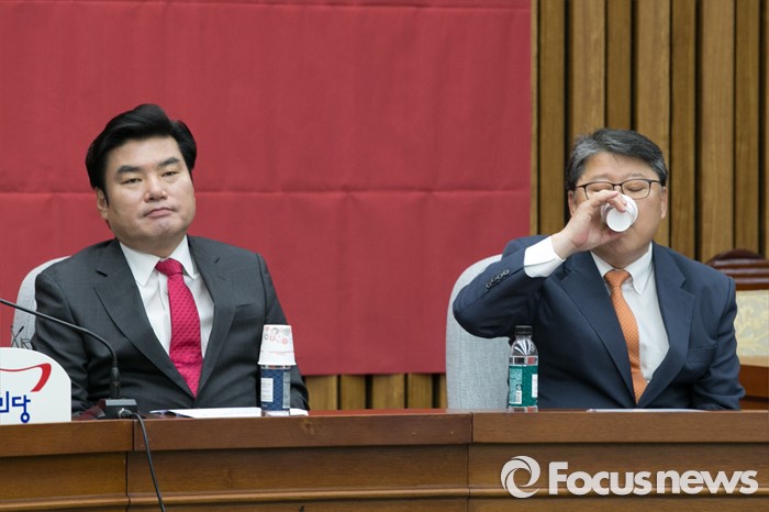 (서울=포커스뉴스) 원유철(왼쪽) 새누리당 원내대표가 22일 오전 서울 여의도 국회에서 열린 원내대책회의에 참석해, 생각에 잠겨 있는 동안, 조원진 원내수석부대표가 물을 마시고 있다.