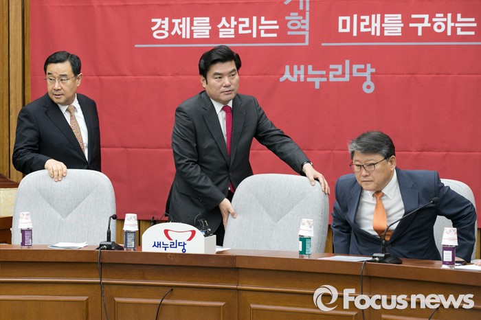 (서울=포커스뉴스) 원유철(가운데) 새누리당 원내대표와 김정훈(왼쪽) 정책위의장, 조원진 원내수석부대표가 22일 오전 서울 여의도 국회에서 열린 원내대책회의에 참석해, 자리에 앉고 있다.