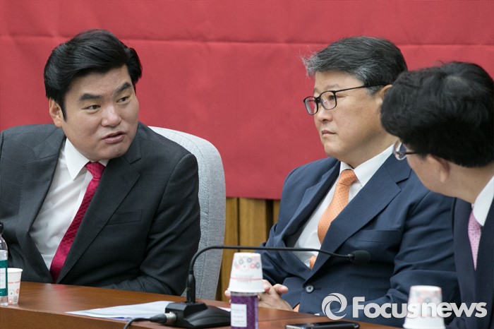 (서울=포커스뉴스) 원유철(왼쪽) 새누리당 원내대표와 조원진(가운데) 원내수석부대표, 권성동전략기획본부장이 22일 오전 서울 여의도 국회에서 열린 원내대책회의에 참석해, 대화하고 있다.