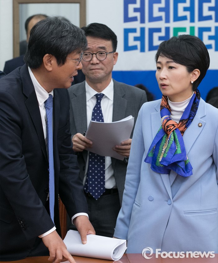 (서울=포커스뉴스) 22일 오전 서울 여의도 국회에서 더불어민주당 비상대책위원회의를 마친 뒤 이춘석(왼쪽부터) 비대위원, 이재경 대변인, 이언주 조직본부장이 대화하고 있다.
