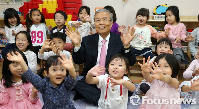 (서울=포커스뉴스) 김종인 더불어민주당 비대위 대표가 22일 오전 서울 여의도 국회 제3어린이집을 방문해, 어린이들과 기념사진을 찍고 있다.