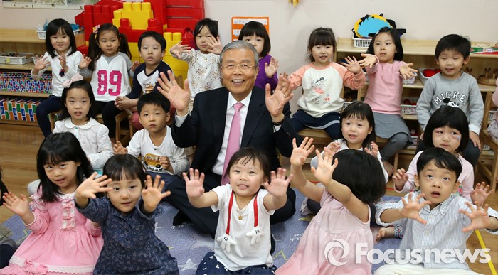 (서울=포커스뉴스) 김종인 더불어민주당 비대위 대표가 22일 오전 서울 여의도 국회 제3어린이집을 방문해, 어린이들과 기념사진을 찍고 있다.