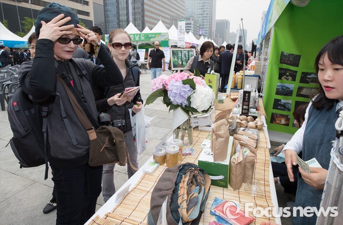 (서울=포커스뉴스) 22일 오전 서울 광화문 광장에서 열린 '2016 광주·전남 귀농귀촌 박람회' 강진군 부스에서 외국인 관광객들이 천연염색두건을 착용해 보고 있다.