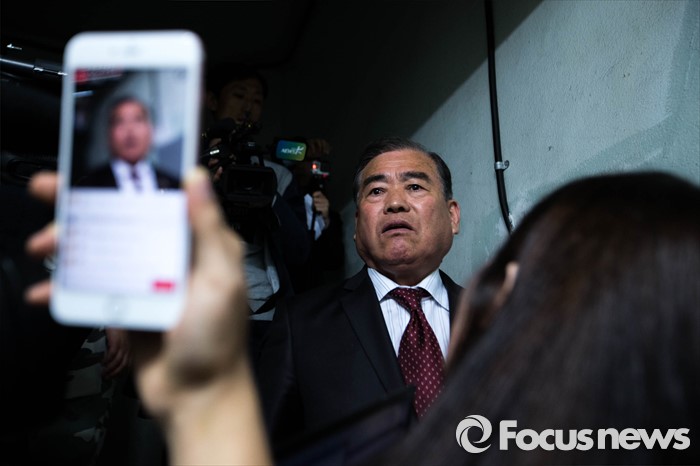 (서울=포커스뉴스) 한 어버이연합 관계자가 22일 오전 서울 종로구에 위치한 어버이연합 사무실에서 기자회견이 끝나고 취재진의 질문을 거부한 채 자리를 떠난 추선희 사무총장, 김미화 대표에게 항의하는 취재진을 막아서고 있다 . 전경련에서 자금지원을 받은 의혹으로 논란에 휩싸인 어버이연합은 이날 기자회견을 열고 언론에 보도된 어버이연합 관련 기사들에 반박했다.