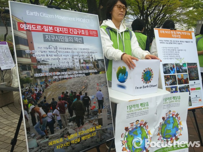 한편 세계지구시민운동연합은 한국을 비롯해 미국, 일본, 중국, 영국, 독일, 러시아, 아일랜드, 벨기에 등 17개국에서 지구환경·평화 운동과 세계시민교육 등 활동을 하고 있다.(서울=포커스뉴스) 22일 서울 종로구 광화문시민열린마당에서 지구시민운동연합 회원들이 제46회 지구의 날을 기념해 '나는 지구시민입니다'라는 주제로 플래시몹을 하고 있다. 2016.04.22 성동훈 기자 22일 서울 광화문 시민열린마당에서 열린 '나는 지구 시민입니다' 캠페인에서 일본·에콰도르 지진 피해자를 위한 성금 모금 운동이 진행됐다. 장지훈 기자 jangpro@focus.co.kr