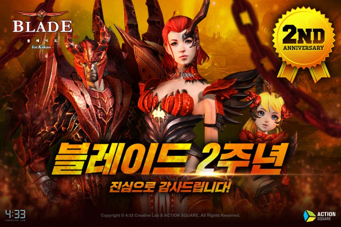 (서울=포커스뉴스) 네시삼십삼분(대표 장원상, 박영호)은 블록버스터 모바일게임 '블레이드 for Kakao'(개발사 액션스퀘어)의 출시 2주년을 기념해 대규모 이벤트를 진행한다고 22일 밝혔다.
