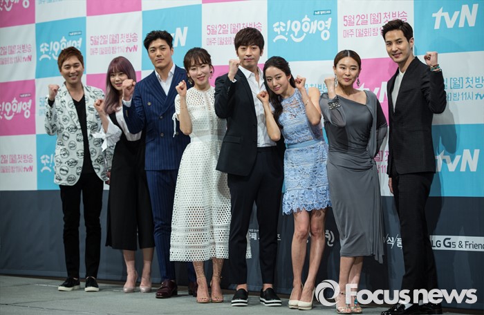 (서울=포커스뉴스) 22일 오후 서울 강남구 임피리얼 팰리스호텔에서 열린 tvN 월화드라마 '또! 오해영' 제작발표회에 참석한 배우 허정민(왼쪽부터), 허영지, 이재윤, 서현진, 에릭, 전혜빈, 예지원, 김지석이 포토타임을 갖고 있다.