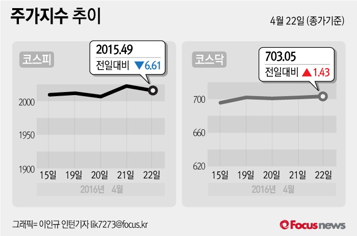 (서울=포커스뉴스) 22일 코스피지수는 전날 보다 0.33%(6.61포인트) 내린 2015.49에 장을 마쳤다. 코스닥지수는 전일 대비 0.20%(1.43포인트) 오른 703.05에 마감했다.