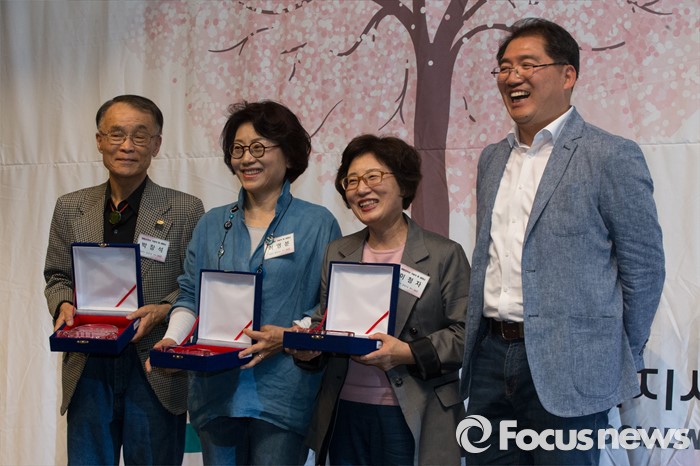 (서울=포커스뉴스) 22일 오후 서울 용산구 백범기념관에서 열린 사회복지사협의회 창립 30주년 기념행사에서 장재구(오른쪽) 사회복지사협회 회장이 공로패를 사회복지사들에게 전달하고 있다.