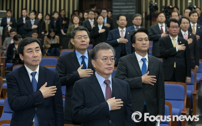 원내대표 경선구도가 조만간 갖춰지기에 더민주의 원내사령탑 자리를 두고 치열한 당내 전쟁이 벌어질 것으로 관측된다.문재인(오른쪽) 새정치민주연합 대표와 이종걸 원내대표 등 의원들이 12일 오전 서울 여의도 국회에서 열린 정책 의원총회에 참석해 국기에 대한 경례를 하고 있다. 2015.11.12 박동욱 기자