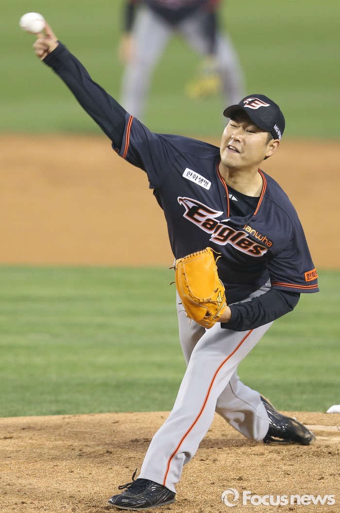 (서울=포커스뉴스) 22일 서울 잠실구장에서 열린 2016 프로야구 한화-두산 경기에서 1회말 한화 선발투수 송은범이 투구하고 있다