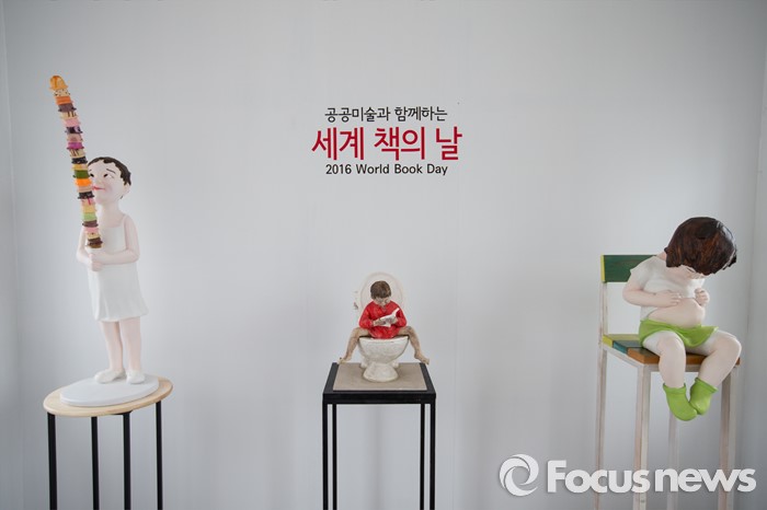 (서울=포커스뉴스) 세계 책의 날을 하루 앞둔 22일 오후 서울 광화문 북측광장에서 열린 '공공미술과 함께하는 월드북 데이' 행사에서 다양한 형태의 예술품이 설치되어 있다.