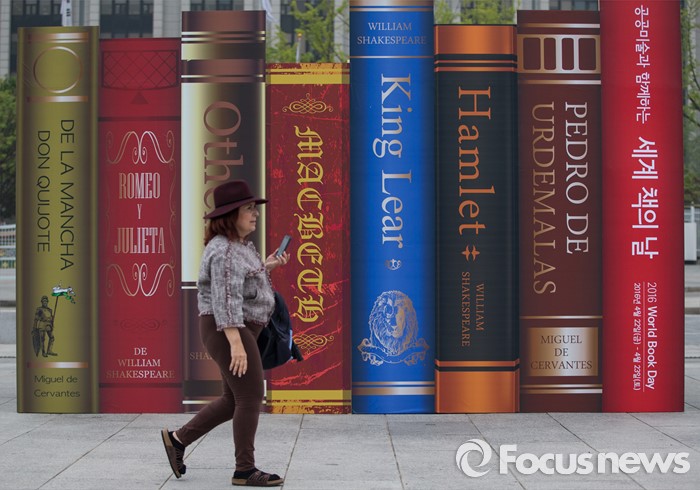 (서울=포커스뉴스) 세계 책의 날을 하루 앞둔 22일 오후 서울 광화문 북측광장에서 열린 '공공미술과 함께하는 월드북 데이' 행사에서 한 외국인이 책 모양의 대형 조형물 앞을 지나가고 있다.