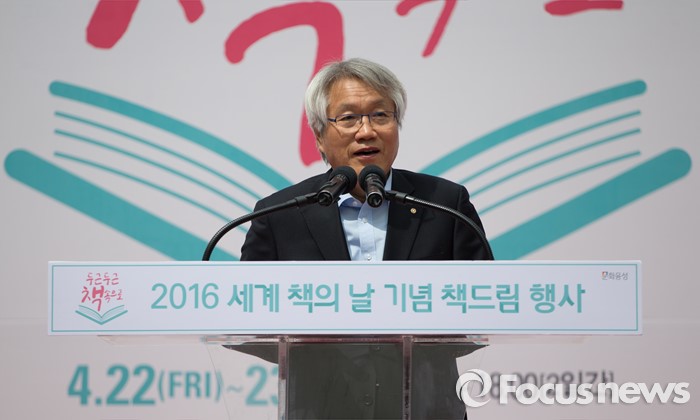 (서울=포커스뉴스)유네스코가 1995년 제정한 ‘세계 책과 저작권의 날’인 23일 오전 서울 중구 청계광장에서 열린 2016 세계 책의 날 기념 책드림 행사 '두근두근 책 속으로'에서 고영수 대한출판문화협회 회장이 인사말을 하고 있다.