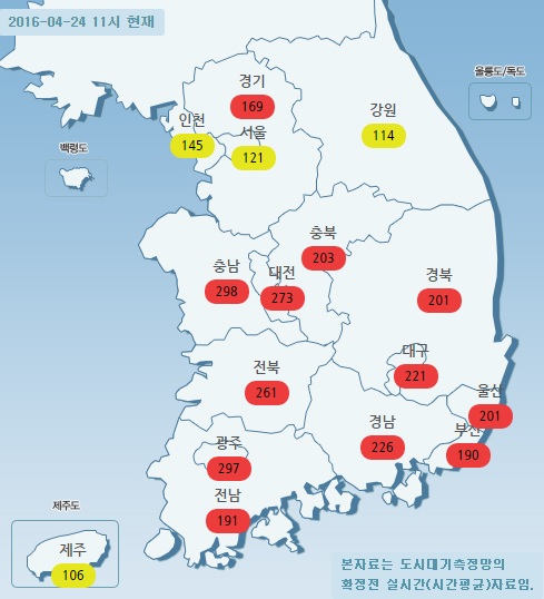 24일 오전 11시 현재 1시간 평균 미세먼지(PM10) 농도 현황은 서울 121㎍/㎥, 경기 169㎍/㎥, 인천 145㎍/㎥, 대전 273㎍/㎥, 전북 261㎍/㎥, 광주 297㎍/㎥, 부산 190㎍/㎥, 대구 221㎍/㎥, 강원 114㎍/㎥, 제주 106㎍/㎥ 이다.
