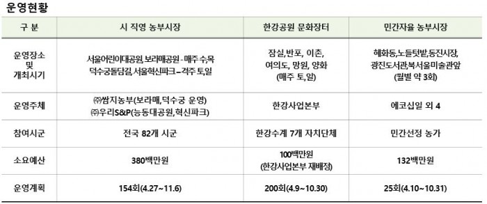 또 민간직거래장터도 동진시장과 북서울미술관 등 5개소에서 열리며, 한강 수계지역의 농가에서 생산된 농산물을 판매하는 '한강문화장터'도 한강공원 6개소에서 열린다.