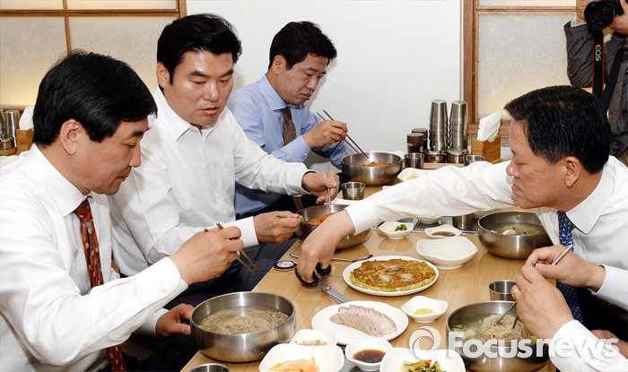 (서울=포커스뉴스) 24일 서울 여의도 한 식당에서 여,야 3당 원내대표가 화합하여 모든 정책을 잘 버무려 내겠다는 비빔냉면과 국민들에게 시원한 정치를 보여주겠다는 뜻의 물냉면을 먹는 오찬 냉면 회동을 갖고 있다.