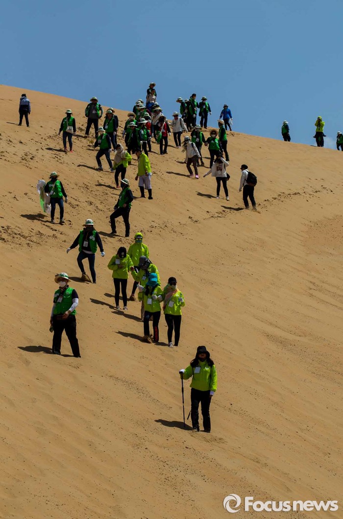 (다라더치/중국=포커스뉴스) 24일 오전 중국 내몽고 다라더치 쿠부치사막에서 한ㆍ중ㆍ일 대학생들로 구성된 2016 미래숲 15기 녹색봉사단원들이 사막트래킹을 하고 있다. 미래숲 녹색봉사단은 이번 봉사활동을 통해 황폐화된 사막에 나무 심기 및 각국 청년들과 우호를 증진을 위한 교류 활동을 전개할 예정이다.