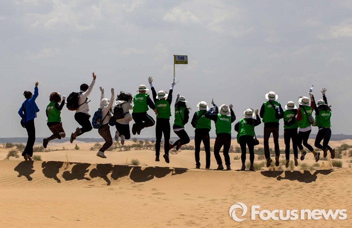 (다라더치/중국=포커스뉴스) 24일 오전 중국 내몽고 다라더치 쿠부치사막에서 한ㆍ중ㆍ일 대학생들로 구성된 2016 미래숲 15기 녹색봉사단원들이 사막트래킹을 하고 있다. 미래숲 녹색봉사단은 이번 봉사활동을 통해 황폐화된 사막에 나무 심기 및 각국 청년들과 우호를 증진을 위한 교류 활동을 전개할 예정이다.