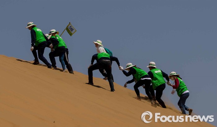 (다라더치/중국=포커스뉴스) 24일 오전 중국 내몽고 다라더치 쿠부치사막에서 한ㆍ중ㆍ일 대학생들로 구성된 2016 미래숲 15기 녹색봉사단원들이 사막트래킹을 하고 있다. 미래숲 녹색봉사단은 이번 봉사활동을 통해 황폐화된 사막에 나무 심기 및 각국 청년들과 우호를 증진을 위한 교류 활동을 전개할 예정이다.