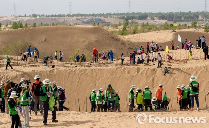 (다라더치/중국=포커스뉴스) 24일 오후 중국 내몽고 다라더치 쿠부치사막에서 2016 미래숲 15기 녹색봉사단 후원사 회원들이 나무심기작업을 하고 있다. 미래숲 녹색봉사단은 이번 봉사활동을 통해 황폐화된 사막에 나무 심기 및 각국 청년들과 우호를 증진을 위한 교류 활동을 전개할 예정이다.
