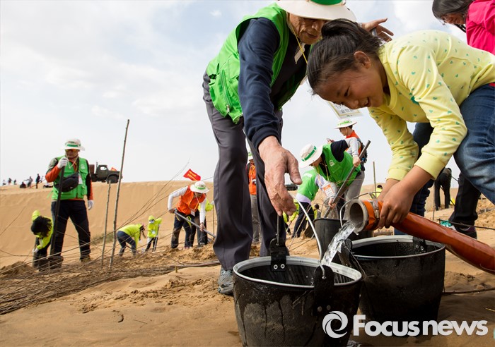 (다라더치/중국=포커스뉴스) 24일 오후 중국 내몽고 다라더치 쿠부치사막에서 2016 미래숲 15기 녹색봉사단 후원사 회원들이 나무심기작업을 하고 있다. 미래숲 녹색봉사단은 이번 봉사활동을 통해 황폐화된 사막에 나무 심기 및 각국 청년들과 우호를 증진을 위한 교류 활동을 전개할 예정이다.