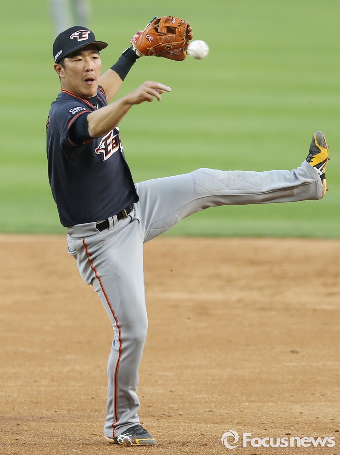 (서울=포커스뉴스) 24일 서울 잠실구장에서 열린 2016 프로야구 한화-두산 경기 5회말 1사 만루에서 한화 2루수 정근우가 두산 건우의 타구를 잡아 1루주자 오재원을 태그아웃 시킨후 1루로 송구해 타자 주자도 잡아 병살을 성공시키고 있다.