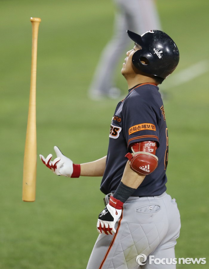 (서울=포커스뉴스) 24일 서울 잠실구장에서 열린 2016 프로야구 한화-두산 경기 7회초 2사 만루에서 한화 정근우가 삼진 아웃으로 물러나며 아쉬워하고 있다.