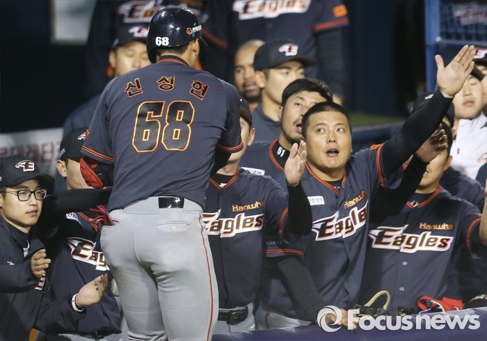 (서울=포커스뉴스) 24일 서울 잠실구장에서 열린 2016 프로야구 한화-두산 경기 9회초 한화 선두타자 신성현이 좌월 솔로 홈런을 치고 덕아웃에서동료들의 환영을 받고 있다.