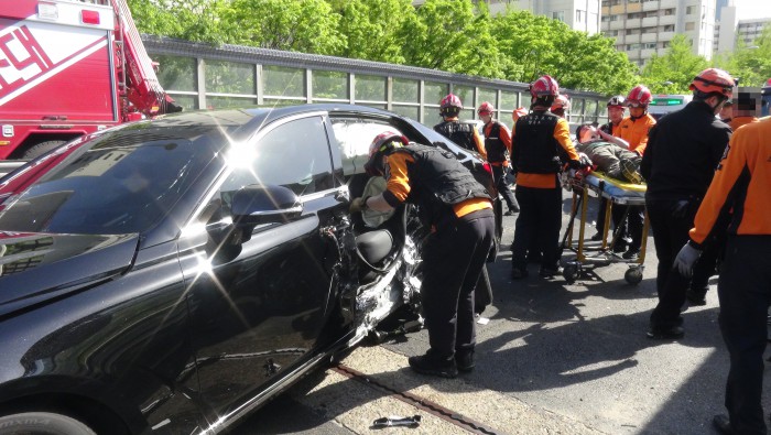 경찰은 정확한 사고 원인을 조사 중이다.24일 오후 3시 39분쯤 서울 여의도동 원효대교 남단에서 차량 2대가 충돌하는 사고가 발생해 출동한 구조대가 구조활동을 벌이고 있다. <사진제공=서울 영등포소방서>