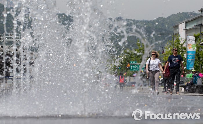 (서울=포커스뉴스) 서울 한낮 기온이 초여름 날씨를 보이는 26일 오후 광화문광장 바닥분수대를 찾은 외국인 관광객들이 즐거운 시간을 보내고 있다.