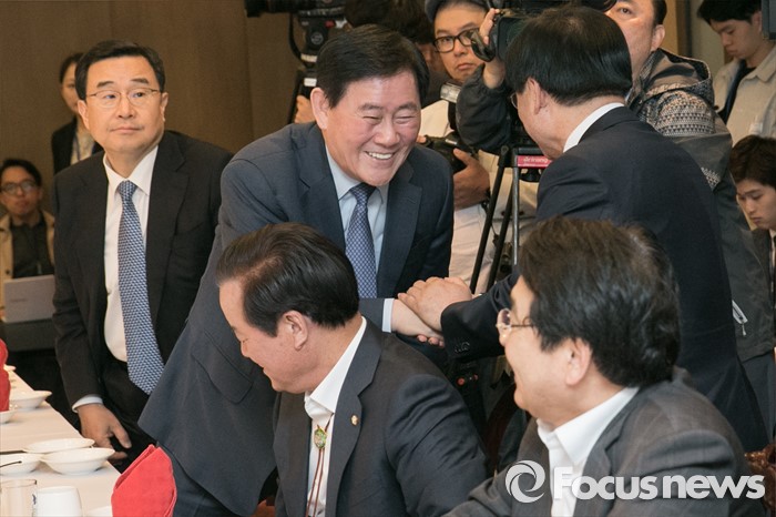 (서울=포커스뉴스) 이주영(뒷줄 오른쪽 뒷모습왼쪽) 새누리당 의원과 최경환 의원이 25일 오후 서울 여의도의 한 중식당에서 열린 중진의원 오찬 간담회에 참석해 악수하고 있다.
