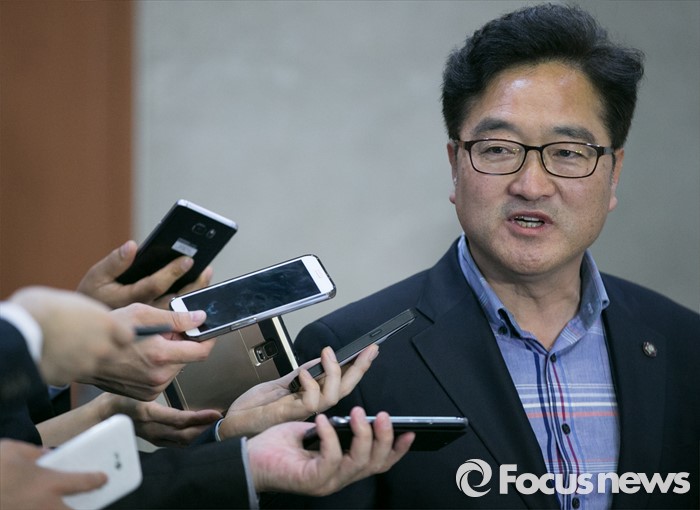 (서울=포커스뉴스) 우원식 더불어민주당 의원이 29일 오후 서울 여의도 국회 정론관에서 원내대표 출마 기자회견을 마친 뒤 취재진 질문에 답하고 있다.