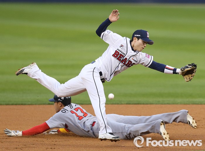 (서울=포커스뉴스) 27일 서울 잠실구장에서 열린 2016 프로야구 SK-두산 경기 1회초 2사 1루에서 SK 1루주자 이명기가 정의윤 타석때 2루 도루를 시도해 세이프되고 있다. 이명기는 두산 포수 박세혁의 송구 실책으로 3루까지 진루했다.