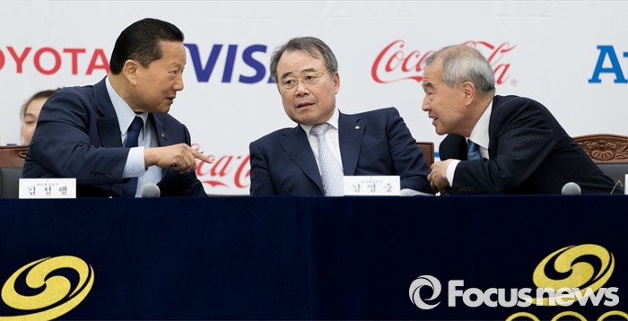 (서울=포커스뉴스) 27일 오후 서울 노원구 태릉선수촌에서 제31회 리우하계올림픽대회 D-100일 미디어데이에 참석한 김정행(왼쪽) 대한체육회장이 조영호(오른쪽) 대한체육회 사무총장과 대화하고 있다. 가운데는 강영중 대한체육회장.