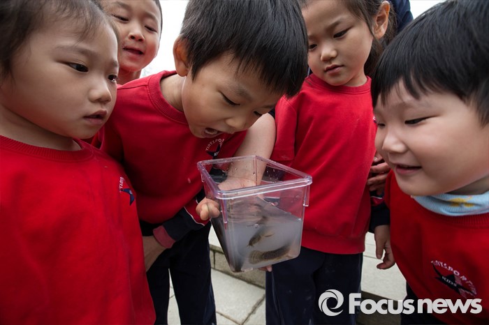 (서울=포커스뉴스) 27일 오전 서울 영등포구 여의도 샛강생태공원에서 어린이들이 모기 퇴치를 위해 방류될 미꾸라지를 구경하고 있다.