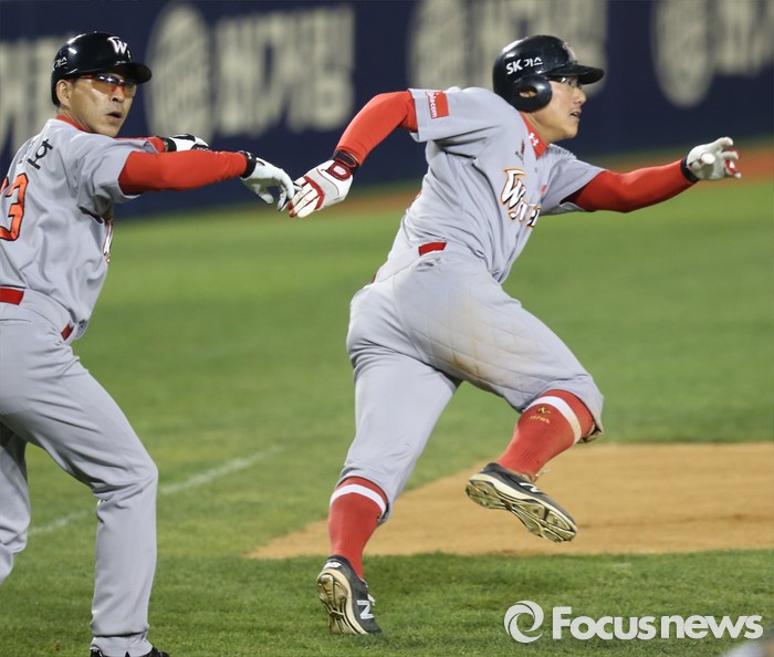 (서울=포커스뉴스) 28일 서울 잠실구장에서 열린 2016 프로야구 SK-두산 경기 9회초 2사 2루에서 SK 김민식의 우전안타때 2루주자 박정권이 홈으로 달리다 김인호 코치의 제지로 황급히 3루로 돌아가고 있다.